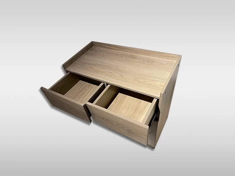 • Multipurpose cabinet made of engineered wood featuring two pull out drawer units and three bottom storage units;